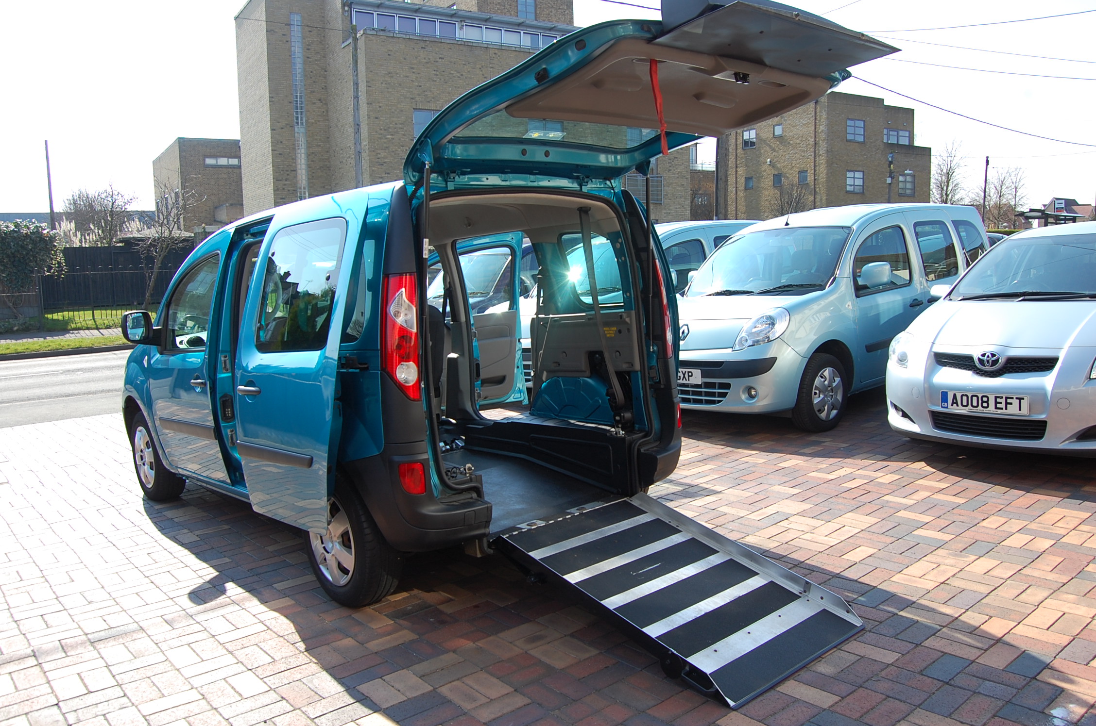 An Essex WAV’s / All Terrain Mobility Renault Kangoo Extreme wheelchair accessible vehicle- with wheelchair/ mobility scooter access ramp on display in our showroom near Southend, Essex.